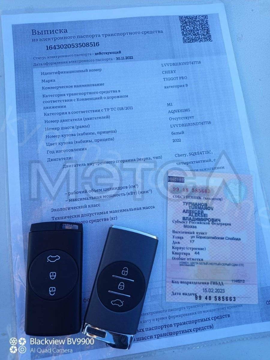 Chery Tiggo 7 Pro, двигатель № AQNK61985, VIN: LVVDB21B3ND747718, цвет: белый, год изготовления: 2022г.